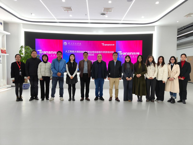 2025 年 11 月 20 日,湖北经济学院外国语学院与传神语联网网络科技股份有限公司(以下简称“传神公司”)联合主办的“人工智能大模型赋能教育应用技能提升师资培训班”在传神公司隆重开幕。湖北经济学院外国语学院院长、数智语言服务现代产业学院院长吴长青,外国语学院副院长徐敏,产业学院副院长(执行院长)范冬梅、传神教育事业部总经理(现代产业学院副院长)张华、教育事业部项目总监靳伟、高级产品经理黄健、培训经理向袁媛及多名参训教师共同出席仪式,标志着校企深化产教融合、助推教育数字化转型迈入新阶段。