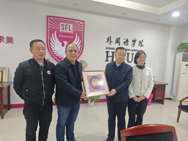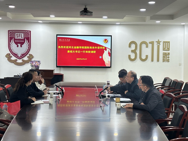 【本网讯】近日,河北金融学院国际商务外语学院党委书记康绍大、院长赵向阁、商务英语教研室主任张欣欣一行赴湖北经济学院外国语学院开展调研交流。湖北经济学院校党委常委许传华、外国语学院党委书记李鹏、院长吴长青、副院长孙小军、翻译(英语)系主任侯香浪、副主任刘京等参与接待并座谈。