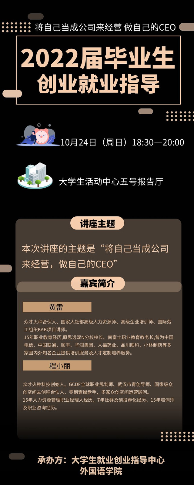 本网讯 (通讯员贾亦菲)10月24日18:30,我院在大学生活动中心五号报告厅成功召开了2022届毕业生就业创业指导会,会议主题是“将自己当成公司来经营,做自己的CEO”,此次活动由大学生就业创业指导中心主办,外国语学院承办。